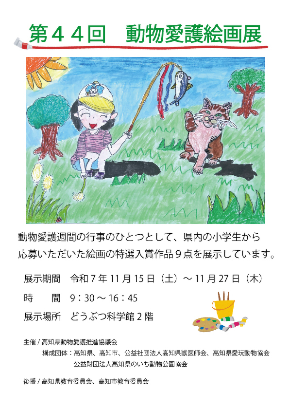 第44回 動物愛護絵画展 2025年11月15日(土)~11月27日(木) 高知県動物愛護推進協議会が主催する「第44回動物愛護絵画展」入賞作品展を開催いたします。 この作品展では、動物愛護週間(9月20日~26日)に関連する行事のひとつとして、県内の小学生から寄せられた動物愛護に関する絵画を展示し、広く県民に動物愛護精神と適正な飼養の啓発を図ることを目的としたものです。 命の大切さや人と動物の関わりなどがよく表現された素敵な作品をぜひご覧ください。 ~第44回 動物愛護絵画展~ 展示期間:2025年11月15日(土)~11月27日(木) 時 間:9:30~16:45 場 所:どうぶつ科学館2階