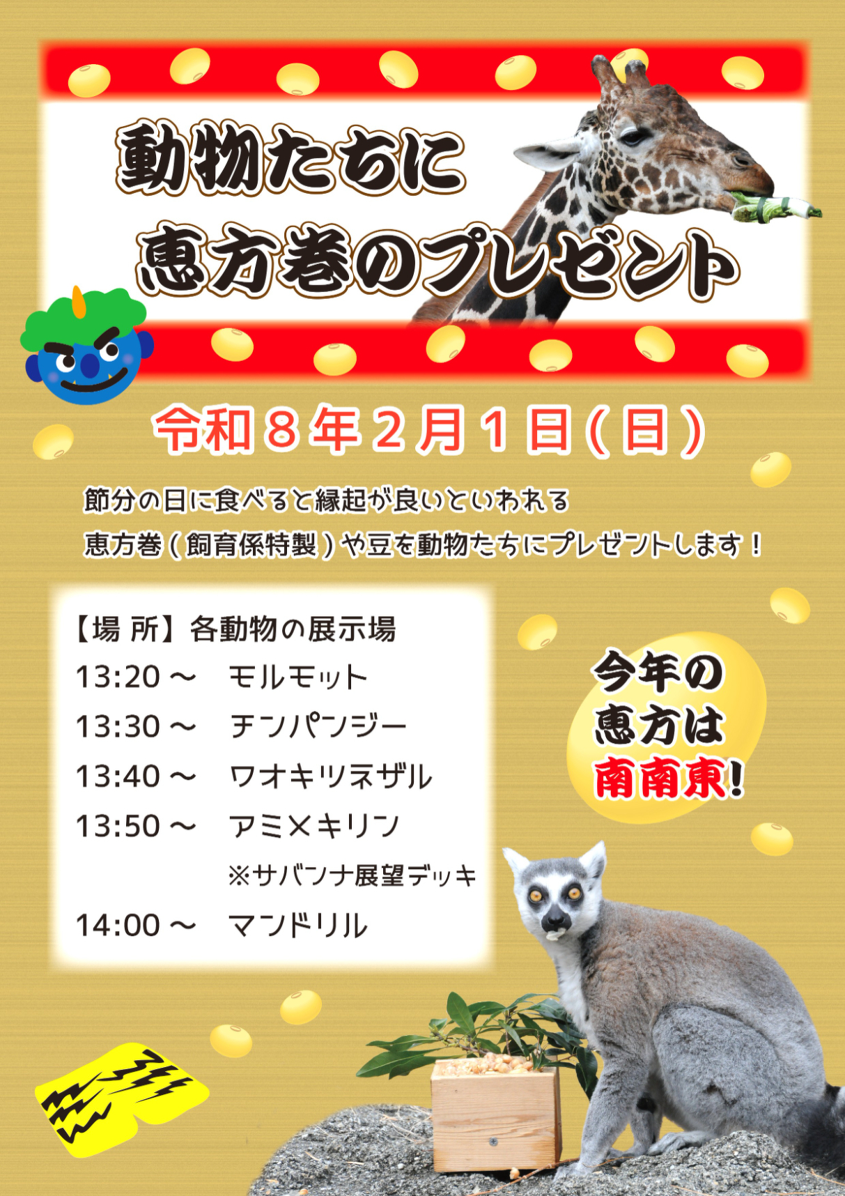 節分イベント「動物たちに恵方巻のプレゼント」 2026年2月1日(日) 動物たちの健やかな成長と健康を願って、節分の日に食べると縁起が良いといわれる恵方巻(飼育係特製)や大豆をプレゼントします。 【場所】各動物の展示場 【時間】13:20~ モルモット 13:30~ チンパンジー 13:40~ ワオキツネザル 13:50~ アミメキリン(サバンナ展望デッキ) 14:00~ マンドリル ※恵方巻のプレゼントに伴い、13:30からのアミメキリンのお食事タイムは中止します。