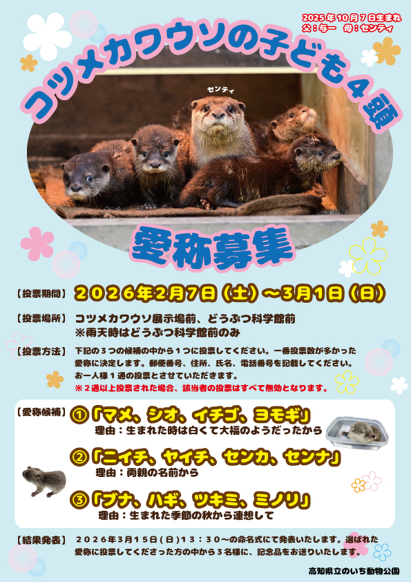 2025年10月7日に生まれたコツメカワウソの子ども4頭の愛称を募集します。