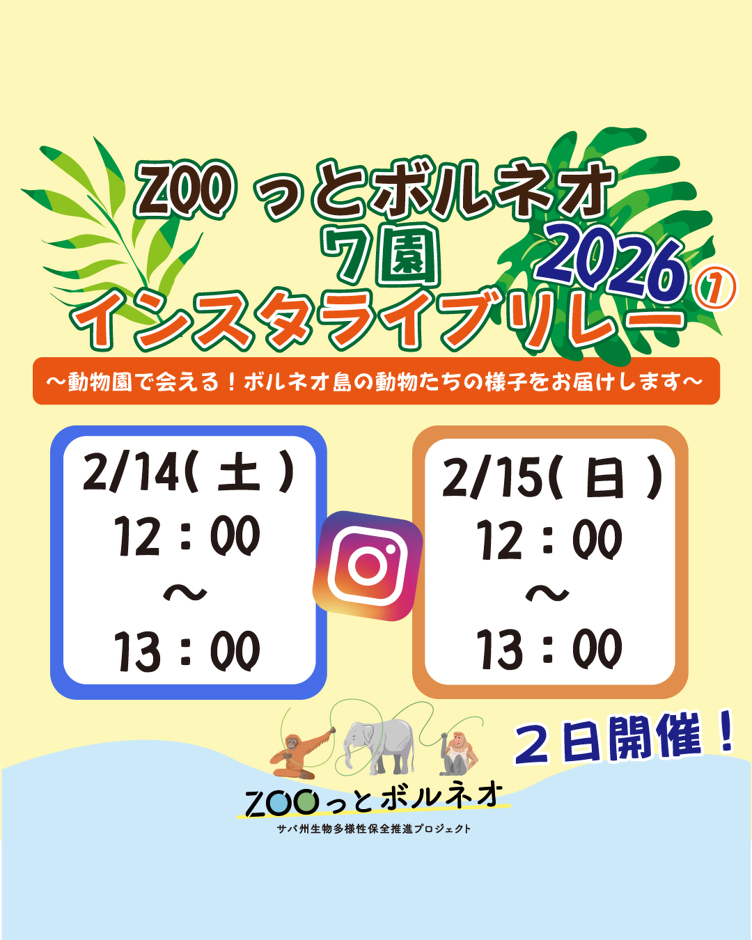 2月14・15日(土・日)はInstagramライブ配信にて、サバ州生物多様性保全推進プロジェクトチームによる「ZOOっとボルネオ7園インスタライブリレー2026①~動物園で会える!ボルネオ島の動物たちの様子をお届けします~」を開催します。