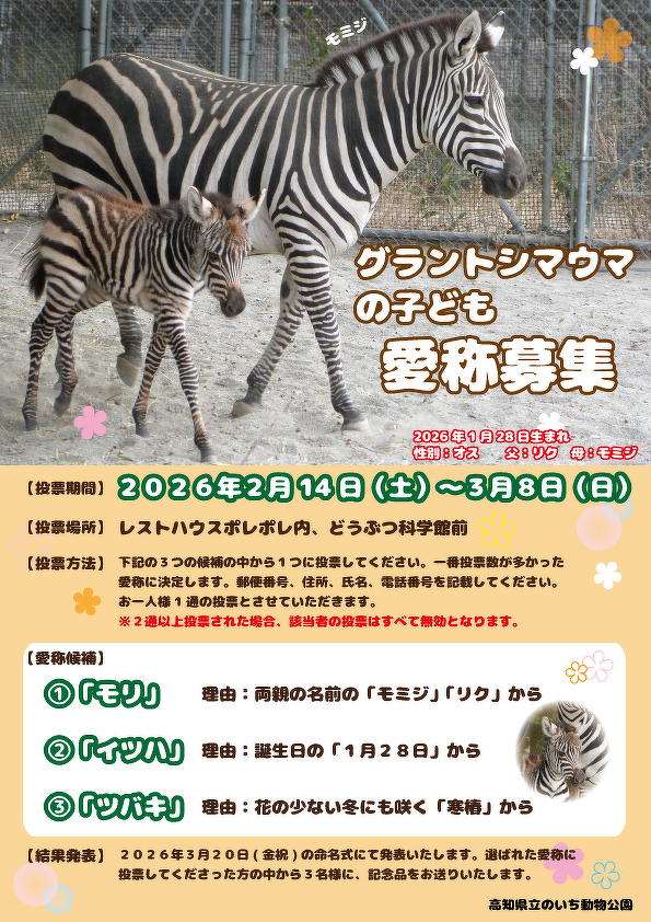 2026年1月28日に生まれたグラントシマウマの子どもの愛称を募集します。