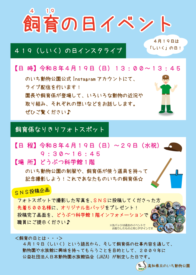 4月19日は飼育(しいく)の日!そこで、下記のとおり飼育の日イベントを開催します!
