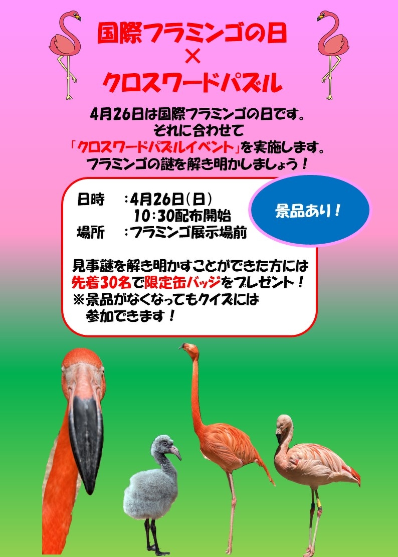 国際フラミンゴの日イベント 開催日 4月26日(日) 10:30~ 4月26日は国際フラミンゴの日です。それに伴い、フラミンゴについて楽しく学べるイベントを行います。 【クロスワードパズルイベント】 クロスワードに答えて、正解した方には缶バッジをプレゼントします! 日時 4月26日(日) 10:30~ 場所 フラミンゴ展示場前 定員 先着30名様