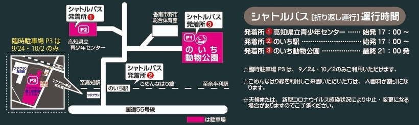 当日は当園駐車場の他、高知県立青少年センターを臨時駐車場としてご利用いただけます。