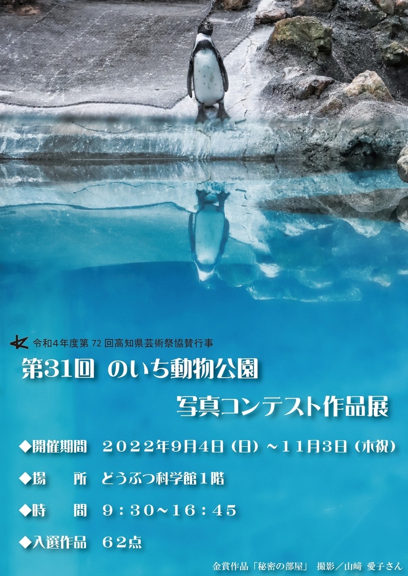 第31回 のいち動物公園 写真コンテスト 作品展 ※終了しました 9月4日(日)~11月3日(木祝) <第31回 のいち動物公園 写真コンテスト 作品展> 入選作品を展示します。 【開催期間】9月4日(日)~11月3日(木祝) 【場 所】どうぶつ科学館1階 【時 間】9:30~16:45 【入選作品】62点