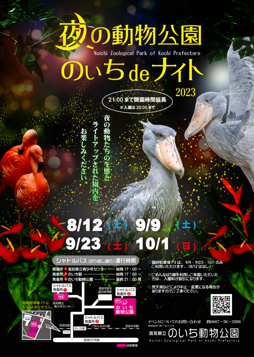 8/12は当園駐車場の他、高知県立青少年センターを、9/9・9/23・10/1は高知県立青少年センターおよびフジグラン野市屋上駐車場を臨時駐車場としてご利用いただけます。また、のいち駅と青少年センターからはシャトルバスを運行します。