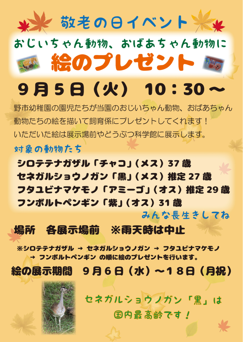 ※終了しました おじいちゃん動物、おばあちゃん動物に絵のプレゼント&作品展示 【絵のプレゼント】2023年9月5日(火)10:30~ 対象動物展示場前 ※雨天中止 【作品展示】2023年9月6日(水)~9月18日(月祝) どうぶつ科学館1階