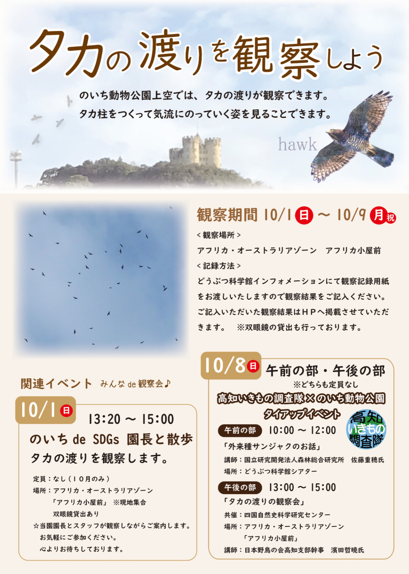 ※終了しました。 タカの渡りを観察しよう 観察期間10/1~10/9 ※10/1と10/8は、観察会実施。 観察に来られた方へ まずは、どうぶつ科学館インフォメーションで観察記録用紙をもらって受付を完了してください。 観察拠点場所は、基本アフリカオーストラリアゾーン アフリカ小屋前かピクニック広場です。 ※園内どこで観察されても記録は可 記録は、当園のHPと日本野鳥の会高知支部の記録に掲載されます。 ※複数人となるため、時間で記録を調整して1日の数を出しますのでご了承ください。