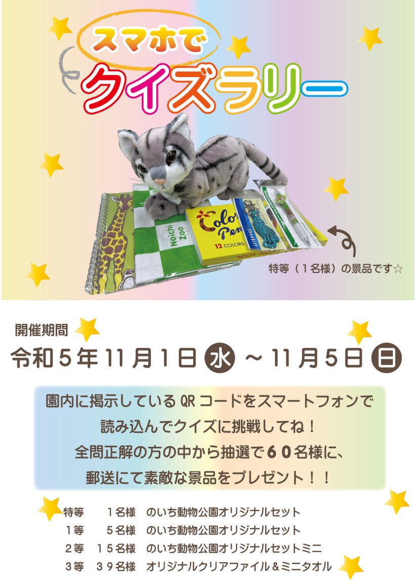開園記念日イベント「スマホでクイズラリー」 令和5年11月1日(水)~11月5日(日) ~開園記念日イベント スマホでクイズラリー~ 開催期間:令和5年11月1日(水)~令和5年11月5日(日) 応募方法:上記の期間に園内に設置しているクイズ問題のQRコードをスマートフォンで読み込み応募してください。 全問正解者の中から抽選で60名様に景品をお送りします。 ※当選した場合の景品郵送のため、個人情報の入力が必須になっています。 ※当選者の発表は景品の発送をもってかえさせていただきます。