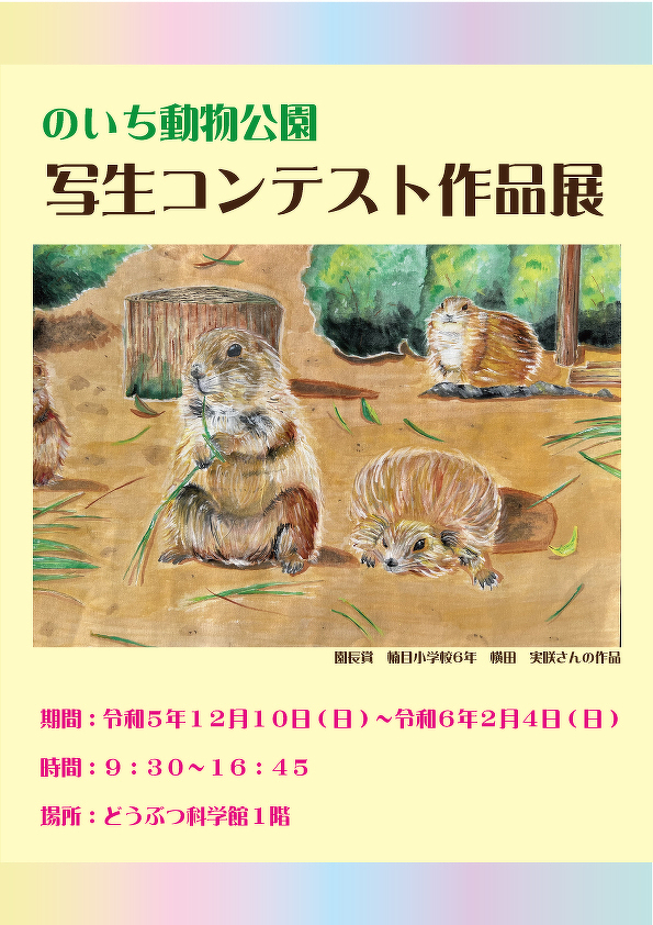 ※終了しました。第31回 のいち動物公園 写生コンテスト作品展 【展示期間】令和5年12月10日(日)~令和6年2月4日(日) 展示期間 令和5年12月10日(日)~令和6年2月4日(日) 時間 9:30~16:45 場所 どうぶつ科学館1階