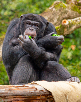 チンパンジーが抱えているピーマンの緑色が鮮やかで、体毛の黒色と好対照となり、非常に引き立っています。それでいて背景の植物の色が柔らかで、優しい雰囲気に包まれています。