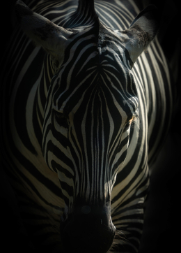 光線状態の良さとグラントシマウマの縞模様、そして力強い構図で、アート作品のような出来映えとなっています。向かって右側から差し込む光で、シマウマのまつ毛や鼻の回りの細かい毛まで美しく光っています。