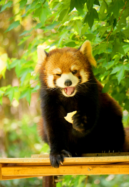 レッサーパンダがまるでウィンクしているような愛らしい表情。舌のピンク色がより一層その愛らしさを際立たせています。好物のリンゴをつかんで食べていますが、ビスケットのようにも見えます。木の葉の緑色も綺麗で爽やかです。