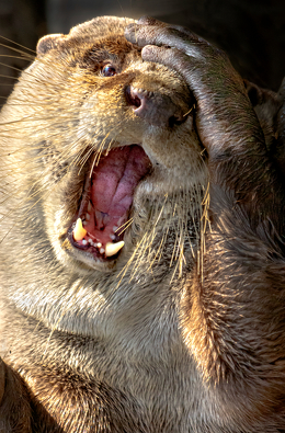ツメナシカワウソのなんともコミカルなこの表情。そして左手で頭を抱えるようなしぐさ。見開いた真ん丸な目と大きく開かれた口。まさにタイトル通りのセリフがぴったりで、何があったのだろうと心配しつつも、そのコミカルさに思わずクスッと笑ってしまいます。