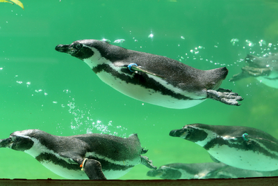 フンボルトペンギンの水槽をガラス越しに撮影しており、ペンギンの体の回りの空気の泡がキラキラと輝くさまが非常に美しく見る者を引きつけます。光の入り方も良く、水の色も綺麗で、まさに夢の中にいるような幻想的な雰囲気を醸し出しています。