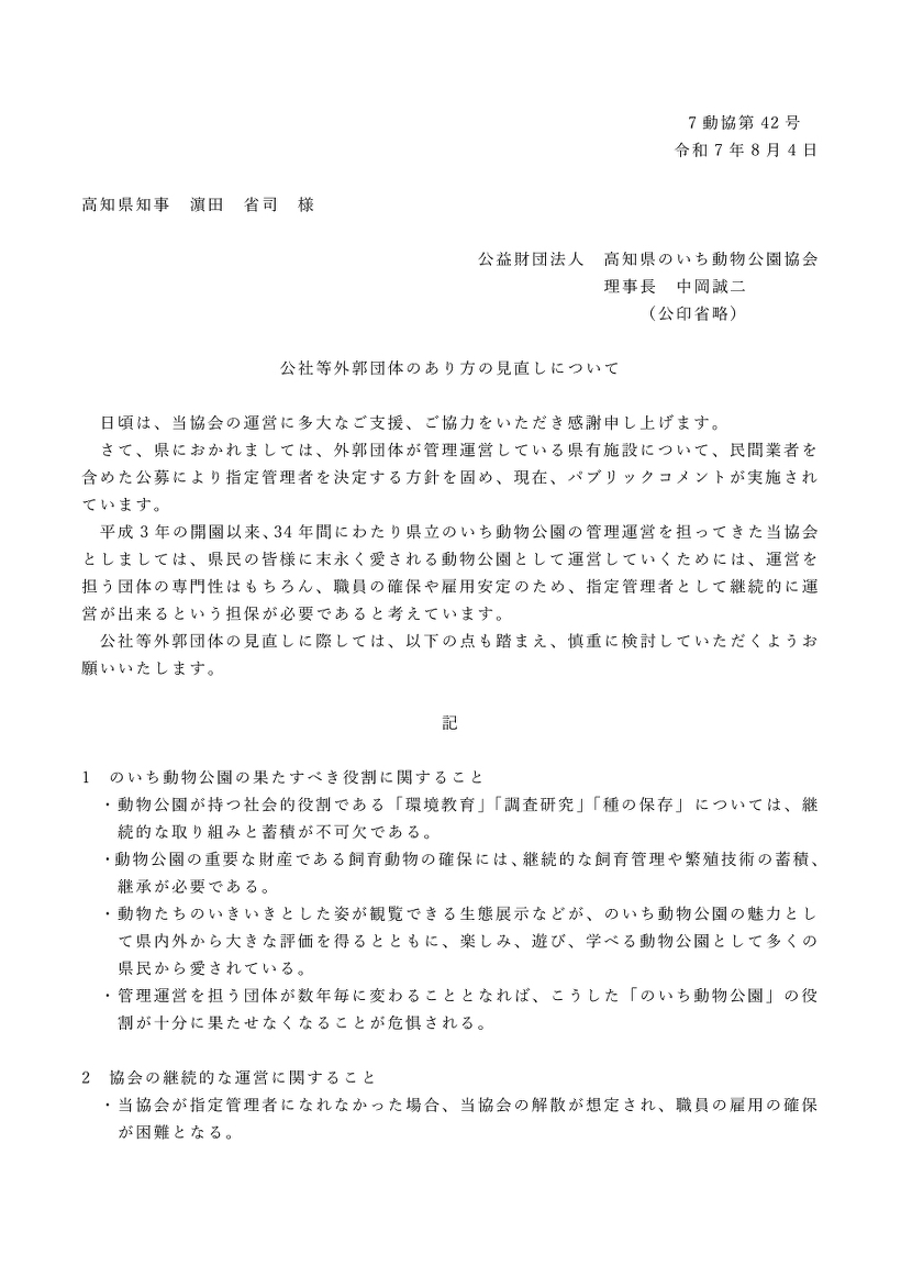 令和7年8月1日(金)に高知新聞で掲載(高知新聞記事)されました「県立施設指定管理 公募へ」に関して、県知事宛に公益財団法人高知県のいち動物公園協会として、「公社等外郭団体のあり方の見直しについて」意見を提出しました。以下全文です。