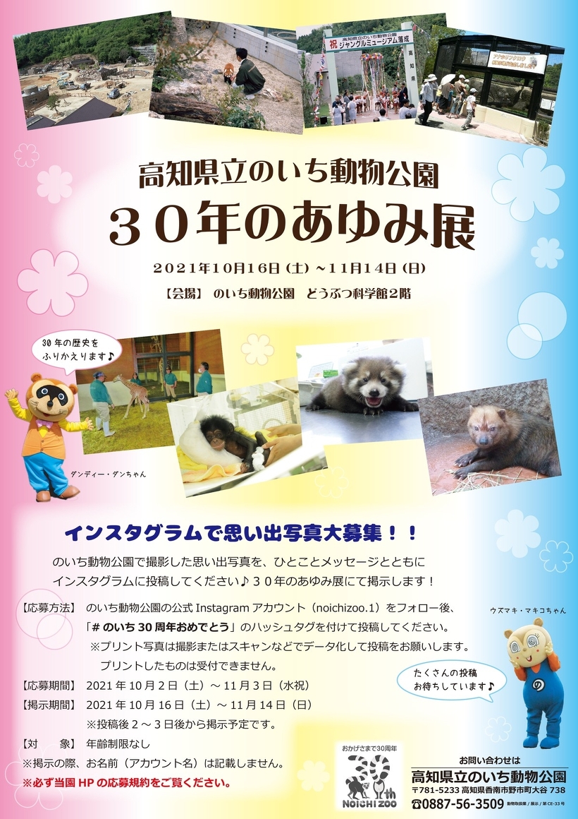 •高知県立のいち動物公園の公式Instagramアカウント(noichizoo.1)をフォロー後、「#のいち30周年おめでとう」のハッシュタグの利用を以て、「応募規約」に同意したものとみなします。