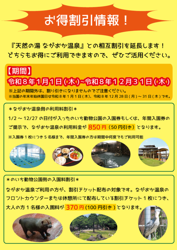 1月2日~12月27日の日付が入ったのいち動物公園の入園券もしくは、年間入園券ご提示で天然の湯 ながおか温泉の利用料が850円(50円引き)となります。