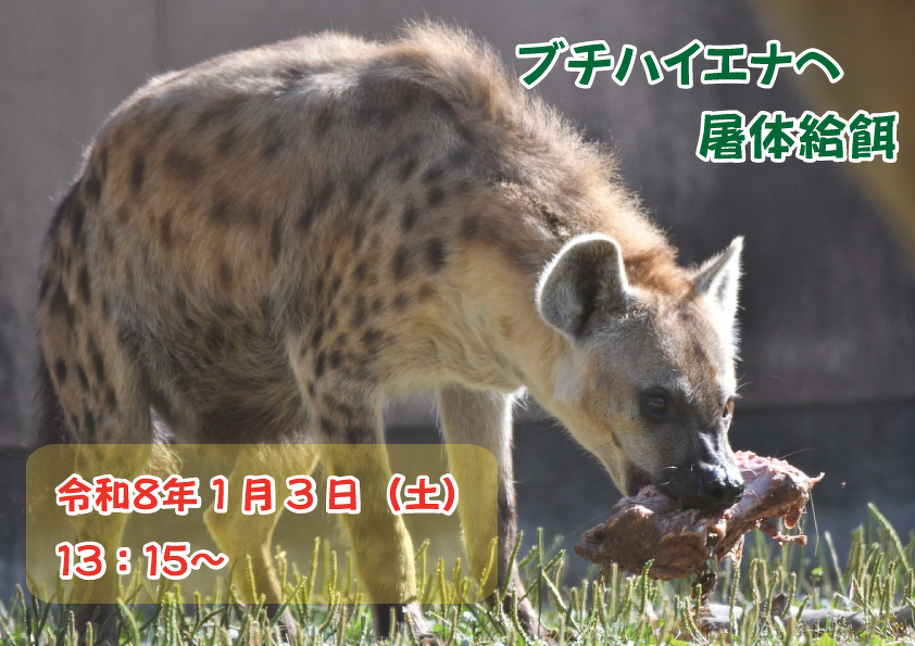 また1月3日(土)は、ブチハイエナへ屠体給餌を行います。毛や皮が付いた肉を与えるため野生本来の行動を引き出し、アニマルウェルフェア(動物福祉)への取り組みにもなっています。