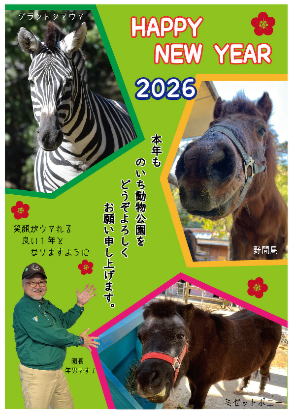 あけましておめでとうございます 2026年01月02日(金) 園からのお知らせ あけましておめでとうございます。 本年ものいち動物公園をどうぞよろしくお願いいたします。 1月2日(金)~4日(日)は、「動物たちのお食事タイム」を実施いたします。 また1月2日(金)~4日(日)は、キッチンカーが出店いたします。 ※「もっと!知りたいモルモット」、「ウマのニンジンタイム」、「リスの小道」は高病原性鳥インフルエンザ対策のためお休みいたします。 皆様のご来園を心よりお待ちしております。