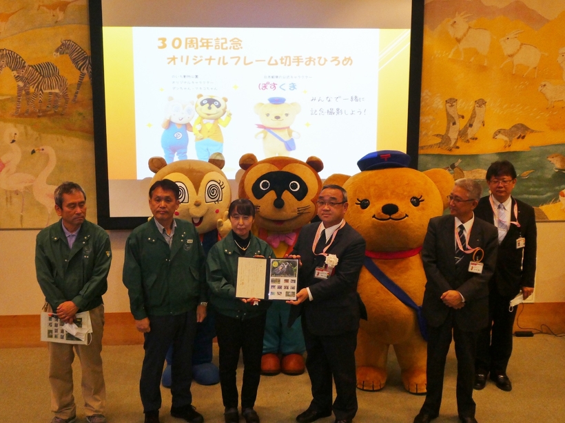 開園30周年記念オリジナルフレーム切手のおひろめを行いました 2021年05月07日(金) 園からのお知らせ 4月29日(木・祝)に、開園30周年記念オリジナルフレーム切手のおひろめを行いました。 式には日本郵便キャラクターのぽすくまも参加してくれて、当園のダンちゃんマキコちゃんと一緒に記念撮影も行いました。 日本郵便の皆様、参加してくれた皆様、本当にありがとうございました。