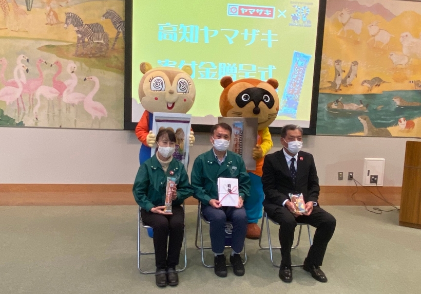 高知ヤマザキとのコラボパンの寄付金贈呈式を行いました 2021年05月07日(金) 園からのお知らせ 5月5日(水・祝)に(株)高知ヤマザキ様からの寄付金贈呈式を行いました。 開園30周年を記念して4月から販売中の「ワオキツネザルのしっぽみたいなパン」の売り上げの一部を寄付していただきました。 寄付金は動物たちの餌代として大切に使わせていただきます。 高知ヤマザキの皆様、パンを買っていただいた皆様、本当にありがとうございました。 またこの日は、6月から販売予定の「ハシビロコウみたいなパン」も無料で配布していただきました。