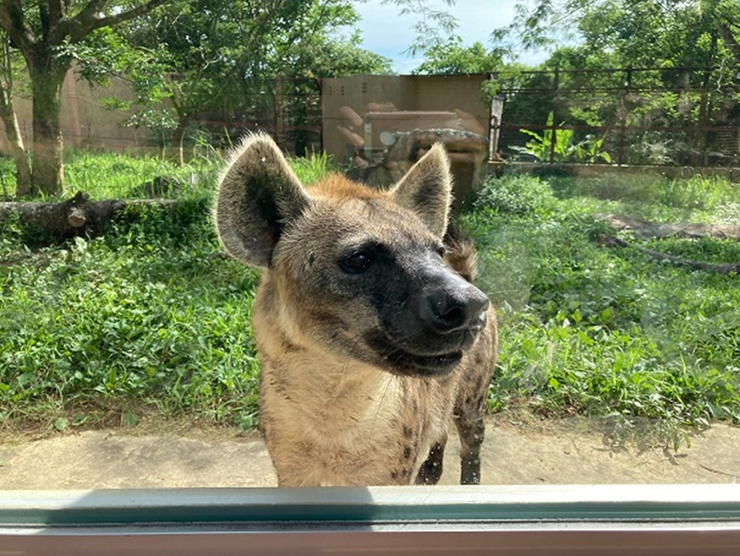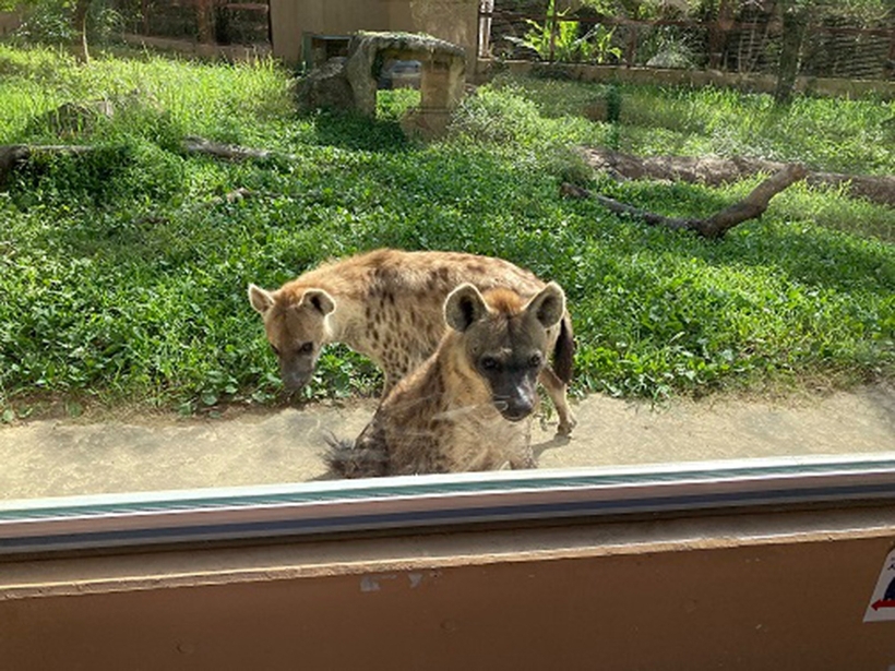 ブチハイエナの「ブッチー」が戻ってきました! 2021年07月20日(火) 園からのお知らせ 6月上旬に皮膚がんの摘出手術を受けたためお休みしていたブチハイエナの「ブッチー」は、傷口がきれいにふさがったので展示場へと戻ってきました!「エナ」との久々の再会に、匂いを嗅いだり鳴き声を上げたりと、お互いに大興奮です。「ブッチー」にとっては「エナ」の尻に敷かれた生活が始まりましたが(笑)、メスをリーダーとするブチハイエナの群れの掟です。いつも温和なブッチーのお陰で、平穏な日常に戻りました♪ 暑い日はプールに入って水浴びしています。 手前「ブッチー」・奥「エナ」
