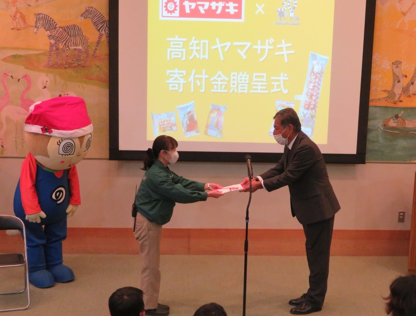 高知ヤマザキ様からの寄付金贈呈式を行いました。 2021年12月20日(月) 園からのお知らせ (株)高知ヤマザキと当園でアイデアを出し合い、今年の4月から11月まで販売されたコラボパンなどの売上げによる寄付金の贈呈式を12月19日に行い、取締役営業部長の工藤様から園長に寄付金目録(582,699円)が授与されました。また、当日は、「ワオキツネザルのしっぽみたいなパン」も来園者の方にプレゼントしていただきました。