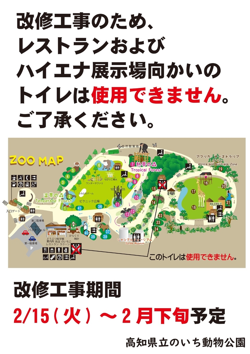 改修工事のため園内のトイレを一部使用できません 2022年02月11日(金) 園からのお知らせ 2月15日(火)~2月下旬までの間、改修工事のため、レストラン「ラクーン」およびハイエナ展示場向かいのトイレは使用できません。ご了承ください。