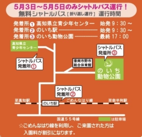 臨時駐車場とシャトルバスのご案内 2024年05月02日(木) 園からのお知らせ 5月3日~5月5日のみシャトルバス運行! 発着所① 高知県立青少年センター 始発9:30~ 発着所② のいち駅 始発9:30~ 発着所③ のいち動物公園 最終17:00 ★ ごめんなはり線を利用し、ご来園いただいた方は入園料が割引になります。
