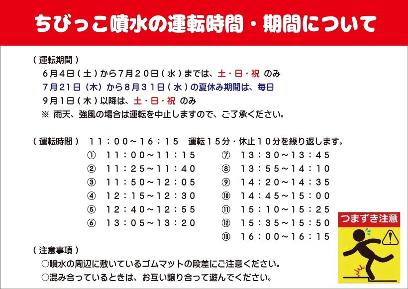ピクニック広場の「ちびっこ噴水」は、6月4日(土)から運転開始します。 詳細は下記の通りです。