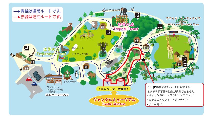 ベビーカー・車イスでご来園のお客様へ 2023年09月24日(日) 園からのお知らせ ジャングルミュージアムのエレベーターが故障中のため、館内を通り抜けることができません。 入口と出口それぞれから入ってご観覧ください。入口から出口へは、お手数ですが、迂回ルートをご利用ください。 上の★地点で迂回ルートに進むとジャングルミュージアム内で引き返さなくて楽ですが、次の動物たちが観覧できなくなります。 ☆オーストラリアゾーンの動物たち(カンガルー・ワラビー・エミュー) ☆ジャングルミュージアムの南米の動物たち(ミナミコアリクイ・アカハナグマ・ナマケモノ)