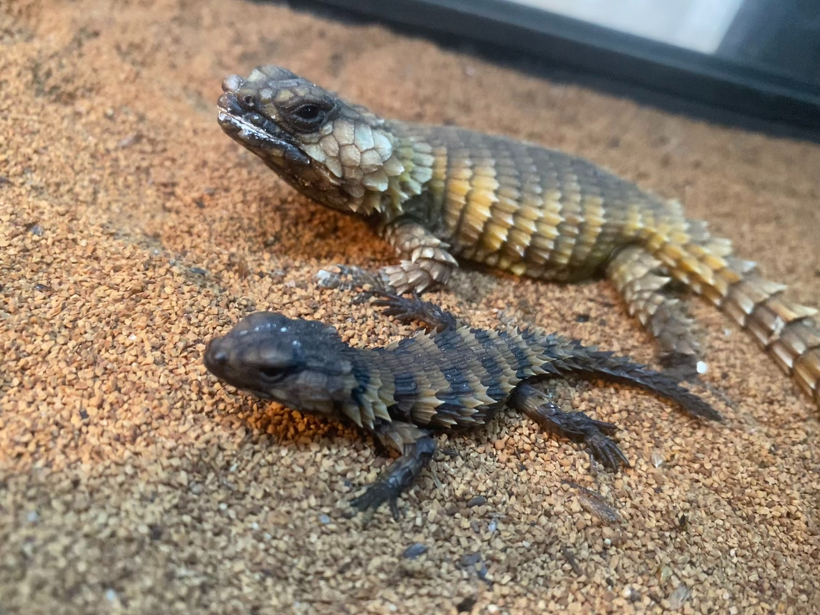 アルマジロトカゲ誕生 2024年08月26日(月) 動物ニュース 8月6日にアルマジロトカゲが生まれました。当園では20例目の繁殖となります。卵を産み繁殖するイメージの強い爬虫類ですが、本種は親個体が子個体を直接生む卵胎生という繁殖様式を取ります。3.7gと当園飼育個体の中では小さいサイズでの出産でしたが、摂餌も確認され、活発に活動しています。アフリカ・オーストラリアゾーンのポレポレ内で展示していますので、みなさま是非ご覧ください。