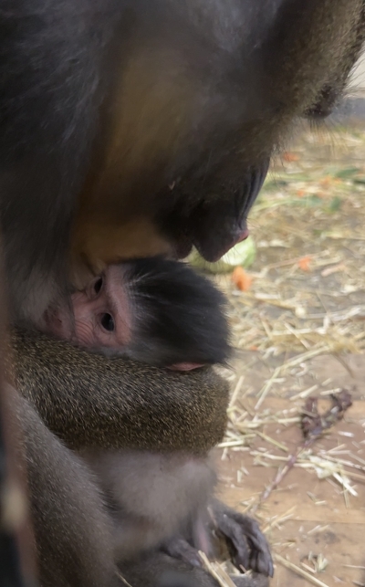 マンドリルが生まれました 2025年06月29日(日) 動物ニュース 2025年6月27日にマンドリルの「マンゴー」が出産しました。3度目の出産ということもあり、落ち着いて子育てを行っています。 2023年生まれの姉「リンゴ」は、初めて見る子どもに興味を示し、優しく見守っているようです。 母子の公開は決まり次第、お知らせいたします。