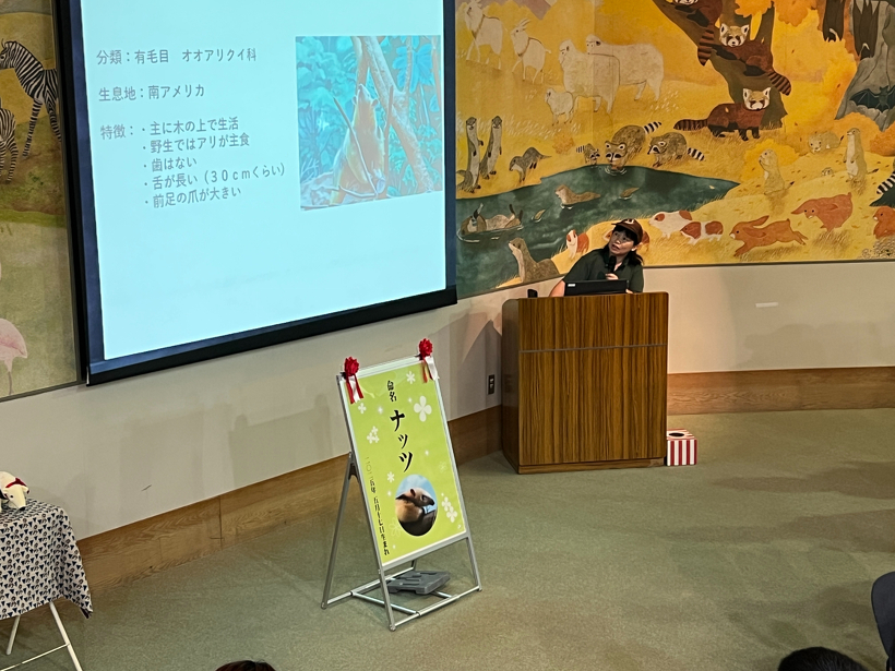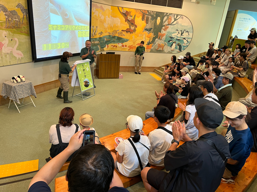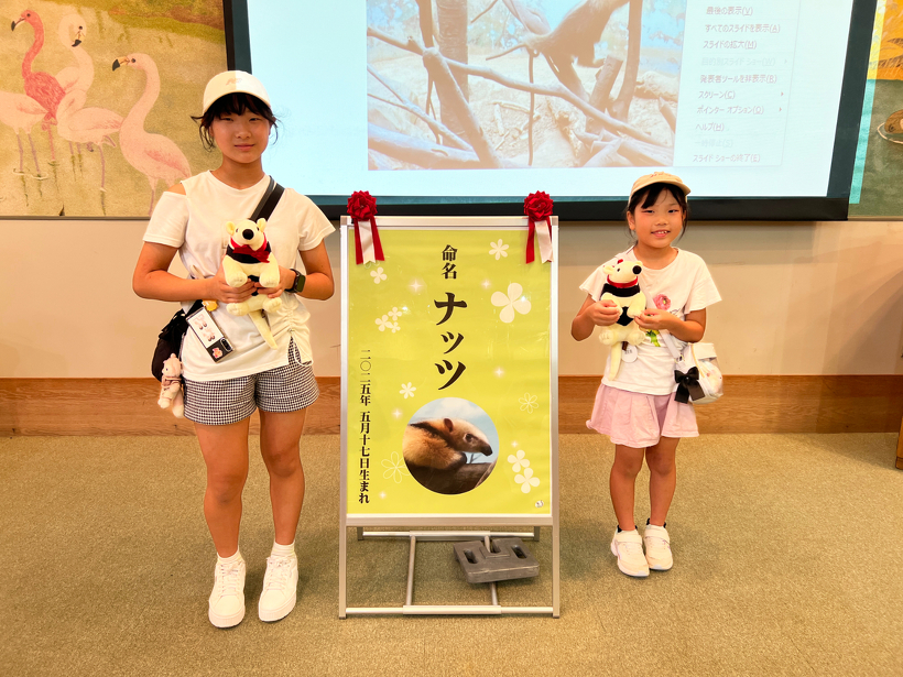 また、本日9月14日にどうぶつ科学館1階シアターにて命名式を行いました。命名式にご参加いただいた方の中から抽選で2名様に、ぬいぐるみをプレゼントしました。