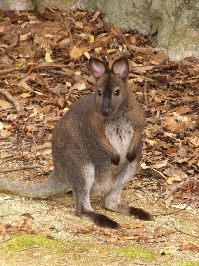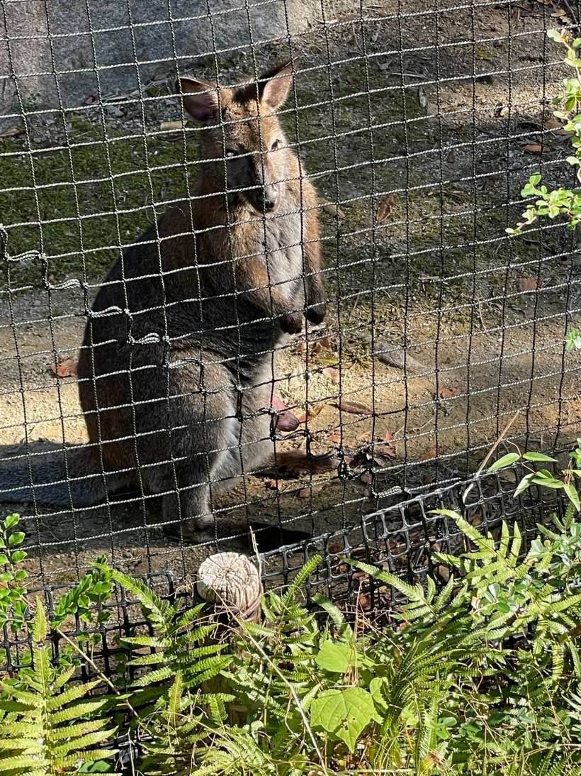 ベネットアカクビワラビーの「のどか」展示場デビュー 2021年12月09日(木) 動物ニュース 12月6日に「のどか」の展示訓練を行いました。「のどか」はのいちに来てから初めての展示場デビューだったので最初は警戒もしていましたが、途中から慣れてきたのか展示場を楽しそうに走り回ったりする場面も見られました。そして、展示訓練中にのどかのお腹の袋からなんと赤ちゃんが顔を出しました。まだ毛も生えておらずとても初々しい姿を見ることができました。これから展示場へ出していこうと思いますので、「のどか」のかわいい姿そしてたまに顔を出す赤ちゃんを見に来てあげてください。