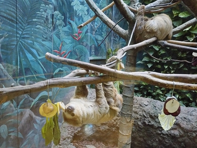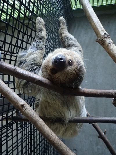フタユビナマケモノ「フウ」の展示を終了しました 2022年12月09日(金) 動物ニュース フタユビナマケモノの「アミーゴ」(オス・推定28歳)と「キュウ」(メス・推定16歳)の6頭目の子ども、「フウ」(オス・1歳)は2022年11月28日に「キュウ」から離れて、ひとり立ちしていましたので、バックヤードに移動しました。フタユビナマケモノの展示は「キュウ」と「アミーゴ」の2頭になりました。「フウ」も落ち着いて、餌をよく食べています。 1頭で餌を食べようとしている「キュウ」(左下)と木の上で休む「アミーゴ」(右上) 1頭でも大丈夫なまでに成長した「フウ」(バックヤード)
