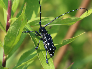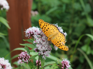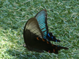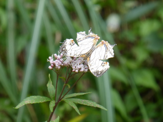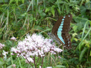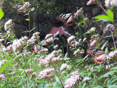 アサギマダラは、日本列島を春に北上、秋には南下し、世代交代しながら渡りをする不思議なチョウです。ふわふわと空を舞う姿は大変優雅ですが、その飛翔能力は海を越えて2,000km以上の旅をするほどのパワーがあります。毎年10月上旬になると自然散策路のアザミやツワブキに飛来します。